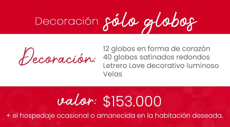 Diseñamos un espacio romántico con globos en forma de corazón, que junto a una frase especial dará a su noche ese ambiente cálido para dejarse llevar por la pasión.